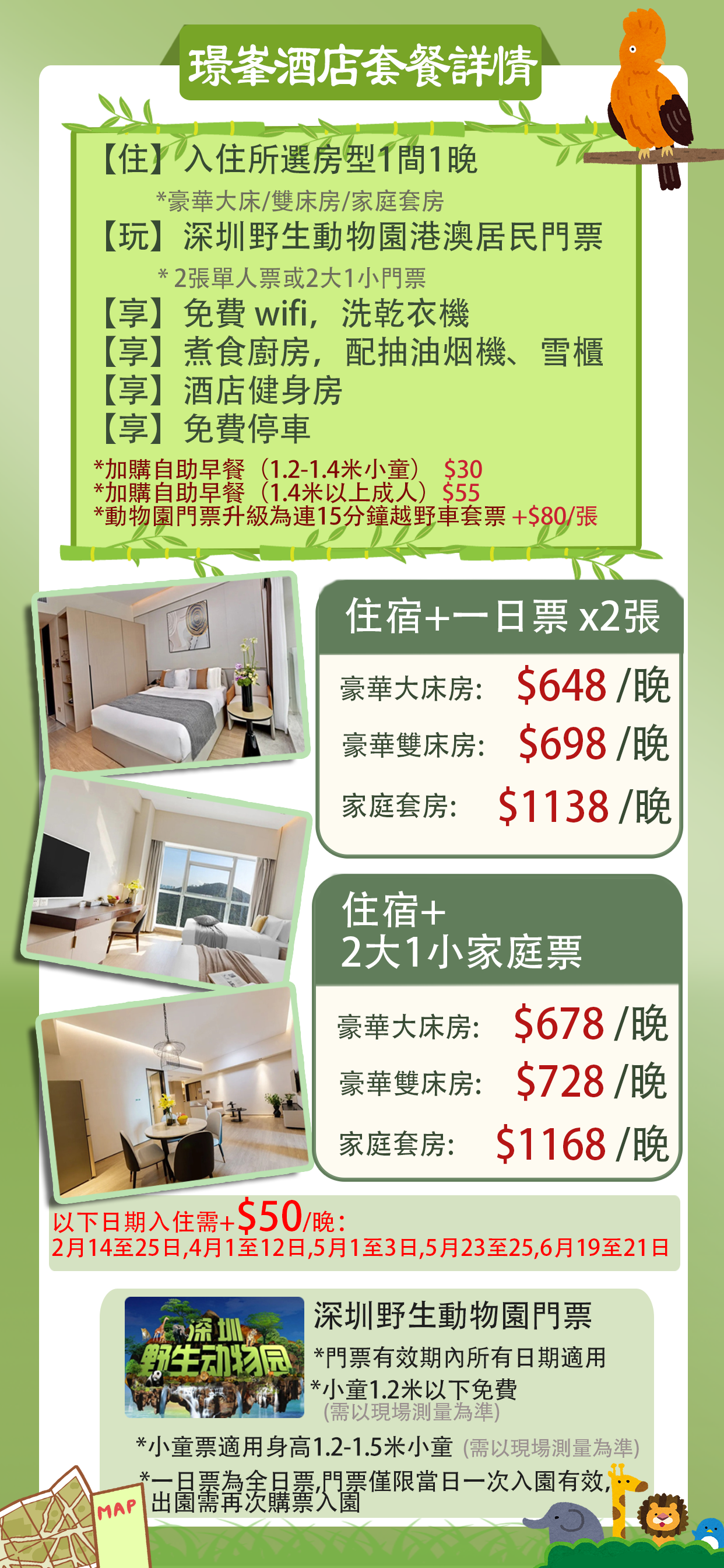 套餐一/二/三:豪華大/雙床/家庭套房 + 2張深圳野生動物園港澳居民門票一日票